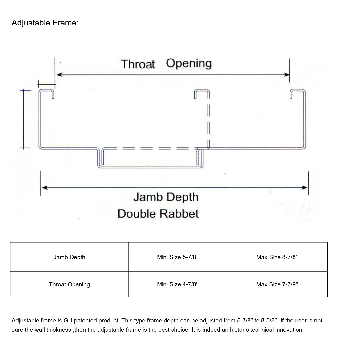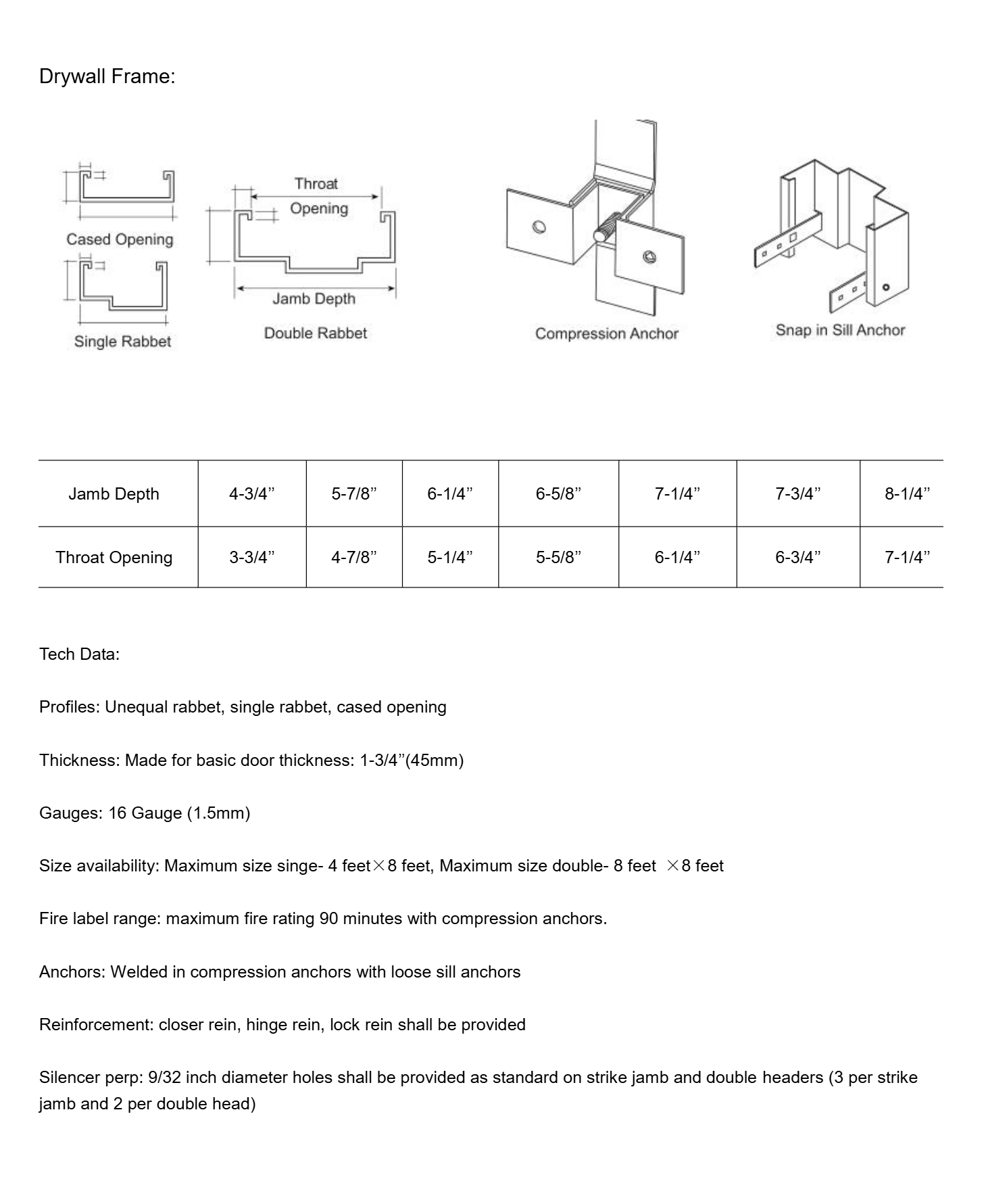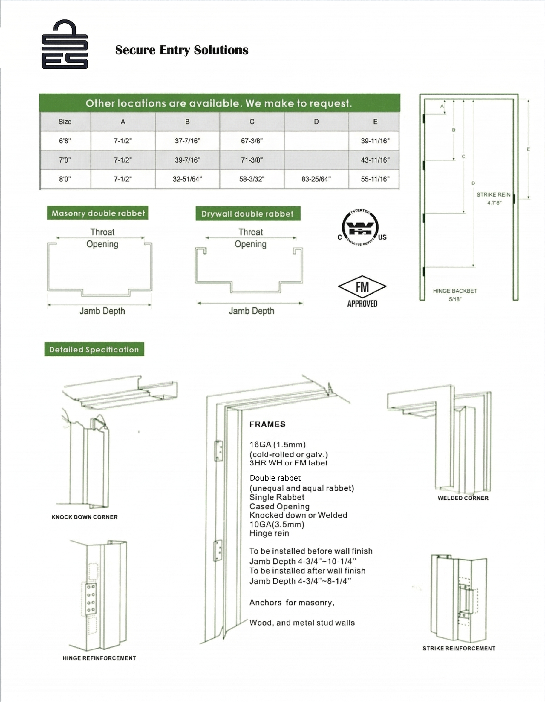 Our steel frames are available in Welded or Knock Down options, featuring 16GA (1.5mm) cold-rolled or galvanized steel with 3HR fire ratings. Supports Masonry and Drywall double rabbet configurations with jamb depths from 4-3/4" to 10-1/4". Includes hinge and strike reinforcement.