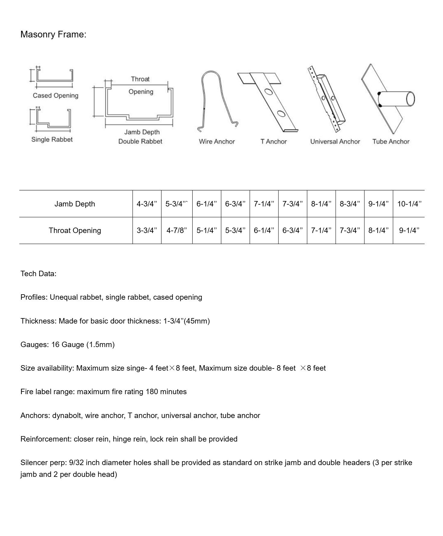 Our high-performance Masonry Frames are 16-gauge steel, supporting 1-3/4" doors with a 180-minute fire rating. Available in single, unequal, or cased profiles with various anchor types (Wire, T, Tube). Sizes up to 4'x8' (single) or 8'x8' (double). Includes full reinforcement for hardware.