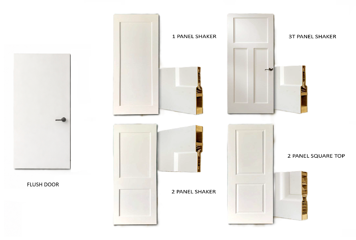 Available Styles: Flush door, 1-Panel, 2-Panel, 3T Shaker, and 2-Panel Square Top.